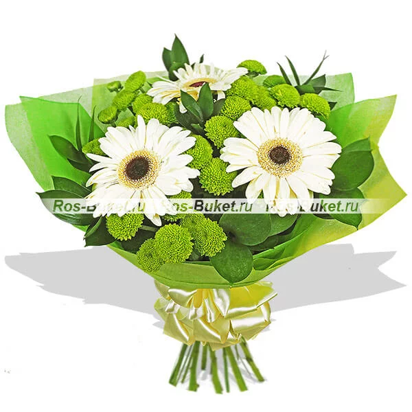 Уменьшенный: гербера белая - 3 шт, хризантема кустовая зеленая - 2 шт, фетр зеленый.